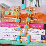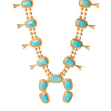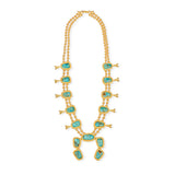 This statement necklace is a show-stopping addition to your jewelry collection! The Squash Blossom Necklace features 15 turquoise stones set into brass plated in 18K gold and accented with flourishes. Unique and eye-catching, this turquoise necklace is the perfect pop of color for your favorite tops and dresses. Featuring authentic turquoise stones sourced from Arizona, this long necklace is hypoallergenic. Curate a playful look whenever you wear this gold Squash Blossom Necklace.