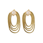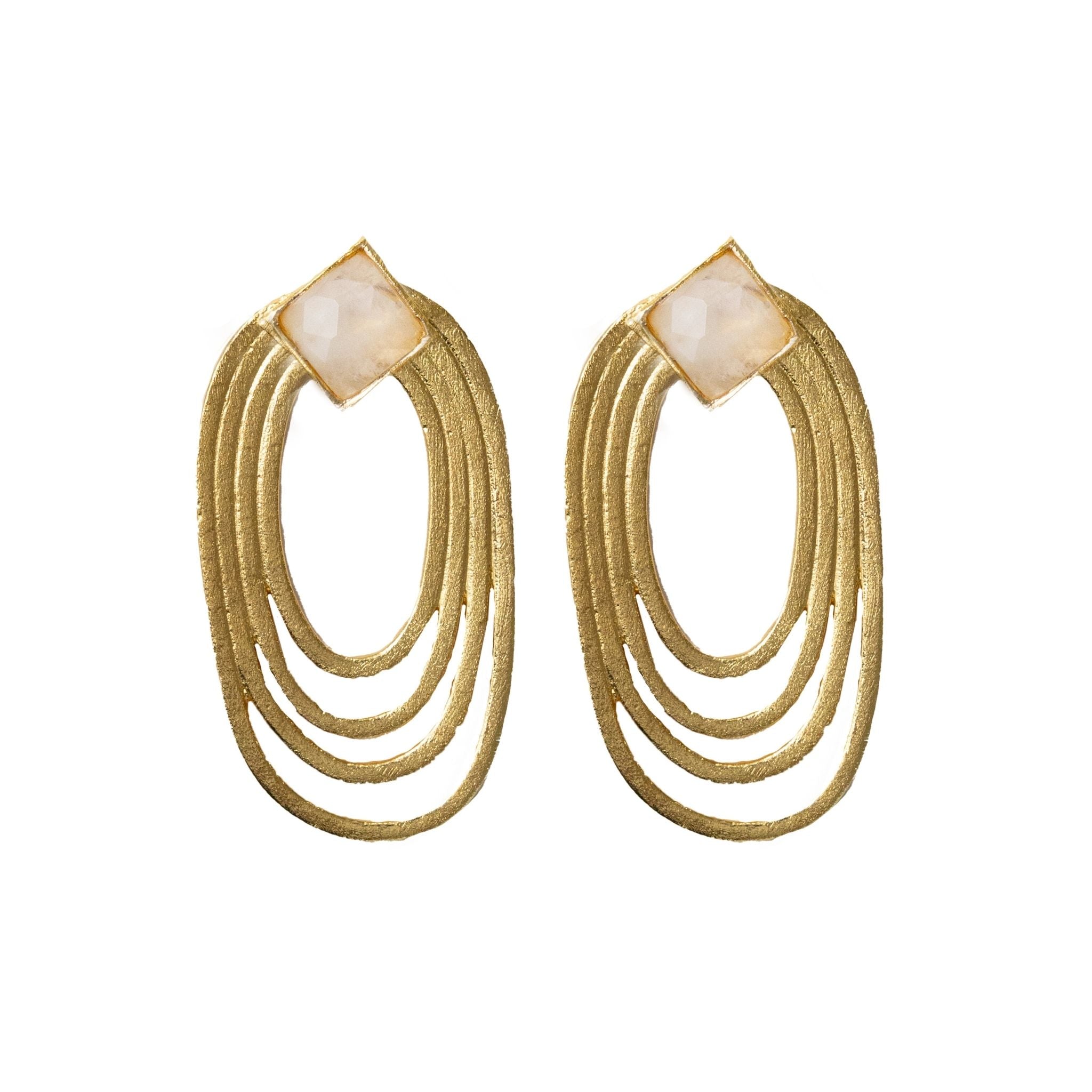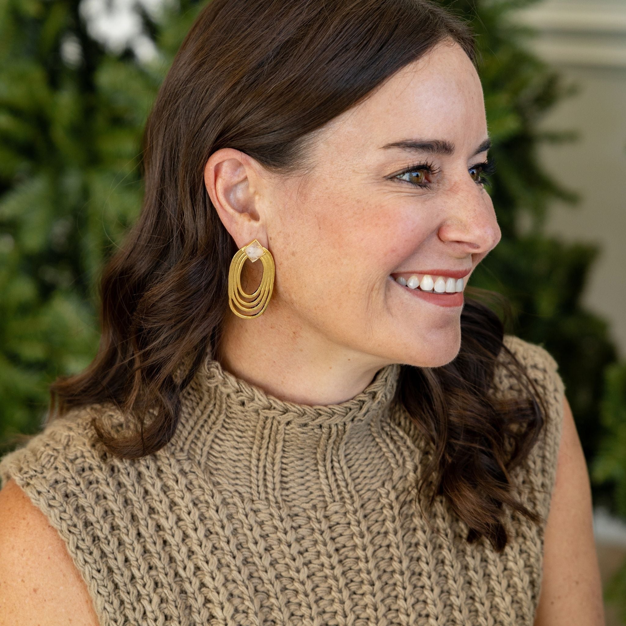 The Winter Garland Stud Earrings feature a square moonstone set at the apex of intertwined 22K gold-plated coils, evoking the glow of a holiday garland shimmering under winter light. These limited-edition stud earrings add subtle movement and elegance to any outfit, making them perfect for holiday parties, gifting, or layering with other gold jewelry.