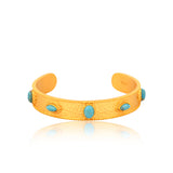 Inspired by Greek mythology, the Aphrodite Cuff is a beautiful addition to any jewelry collection. This bracelet features oval-shaped turquoise stones in alternating sizes that is set into hammered 18K gold-plated brass. Studded details flank the edges and the settings of the stones for a beautifully textured design. An open back makes this gold bangle adjustable or your own comfort.