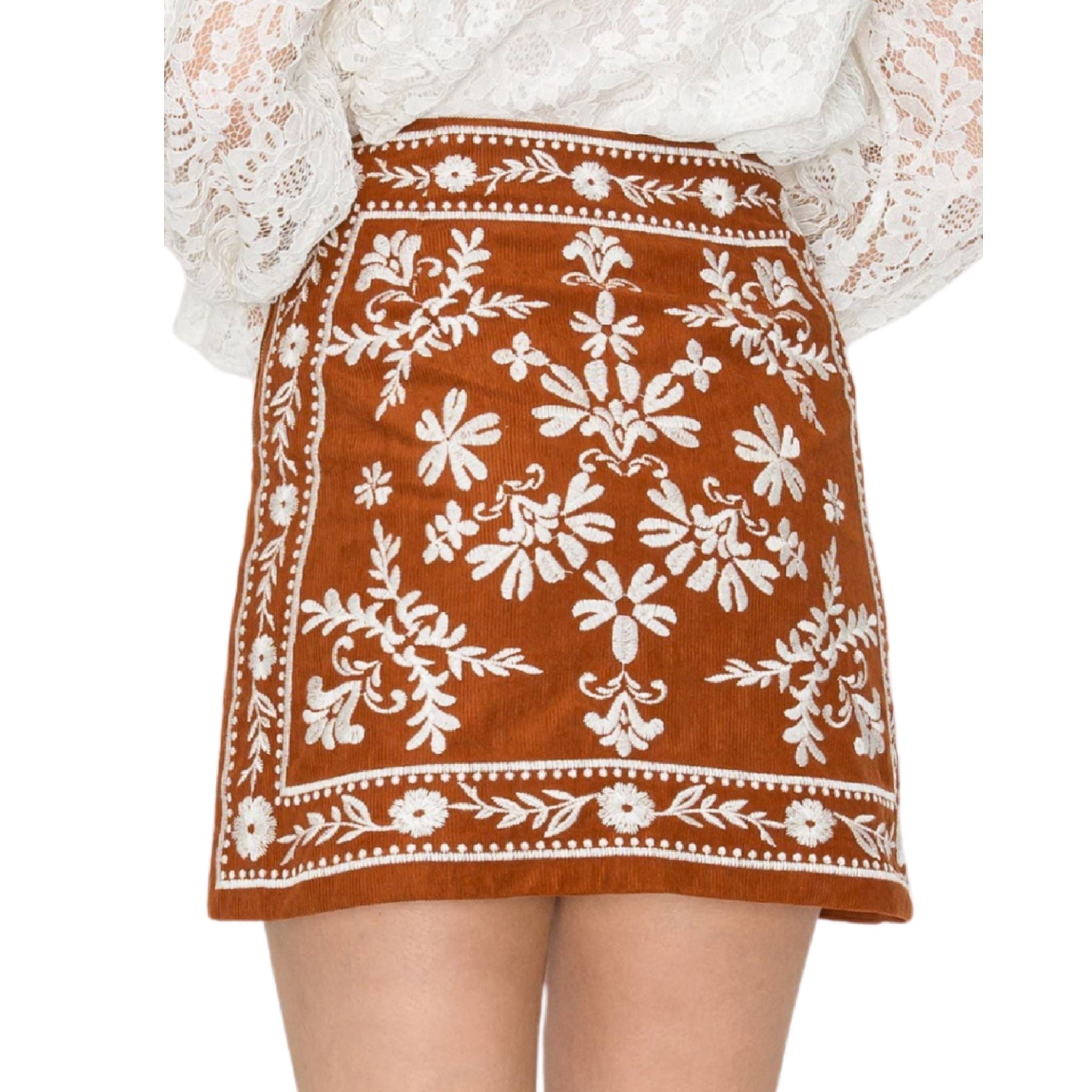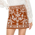 This embroidered mini skirt features a rich camel-brown base accented with intricate ivory floral detailing for a timeless, artisan-inspired look. Designed with a clean, structured silhouette and flattering high-rise fit, it adds a touch of western romance while remaining easy to style with blouses, knits, or denim for polished everyday wear.