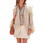 Elegant long-sleeve blouse designed with a plunging V-neckline for a sophisticated, feminine look. Layered ruffle detailing cascades down the front, adding soft texture and movement. Voluminous pleated bell sleeves enhance the romantic silhouette while creating a graceful drape. The lightweight design offers both comfort and effortless elegance. Perfect for pairing with tailored pants or skirts for both elevated everyday wear and special occasions.