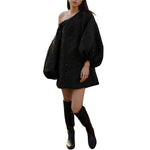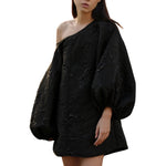 The Good Luck Dress - Black offers a striking blend of drama and sophistication, featuring rich tonal jacquard that creates depth and texture in an all-black finish. Its signature silhouette—complete with sculptural balloon sleeves and an elegant one-shoulder neckline—makes an effortlessly bold statement while maintaining a comfortable, relaxed fit. Perfect for evenings out, special occasions, or anytime you want a modern, elevated look with unmistakable presence.