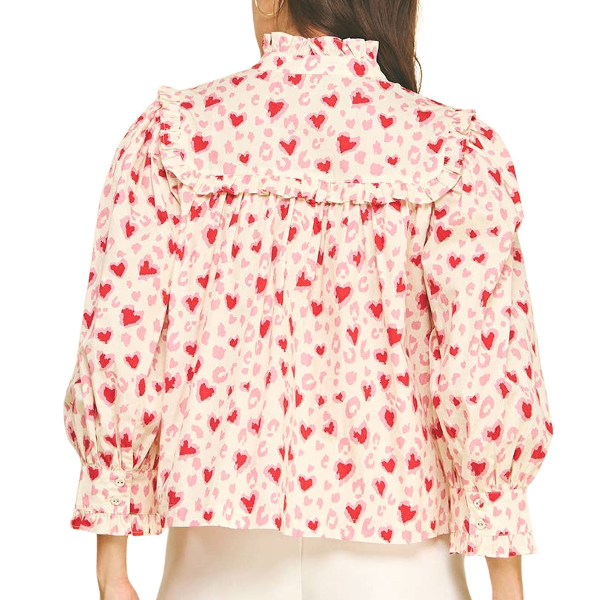 Sweet and stylish, this hearts pattern blouse top adds a playful pop to your wardrobe. Featuring a ruffled collar, button-down front, and soft voluminous sleeves, it’s the perfect blend of feminine charm and everyday comfort. Pair it with jeans or shorts for a cute, effortless look that stands out.