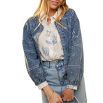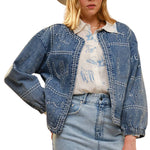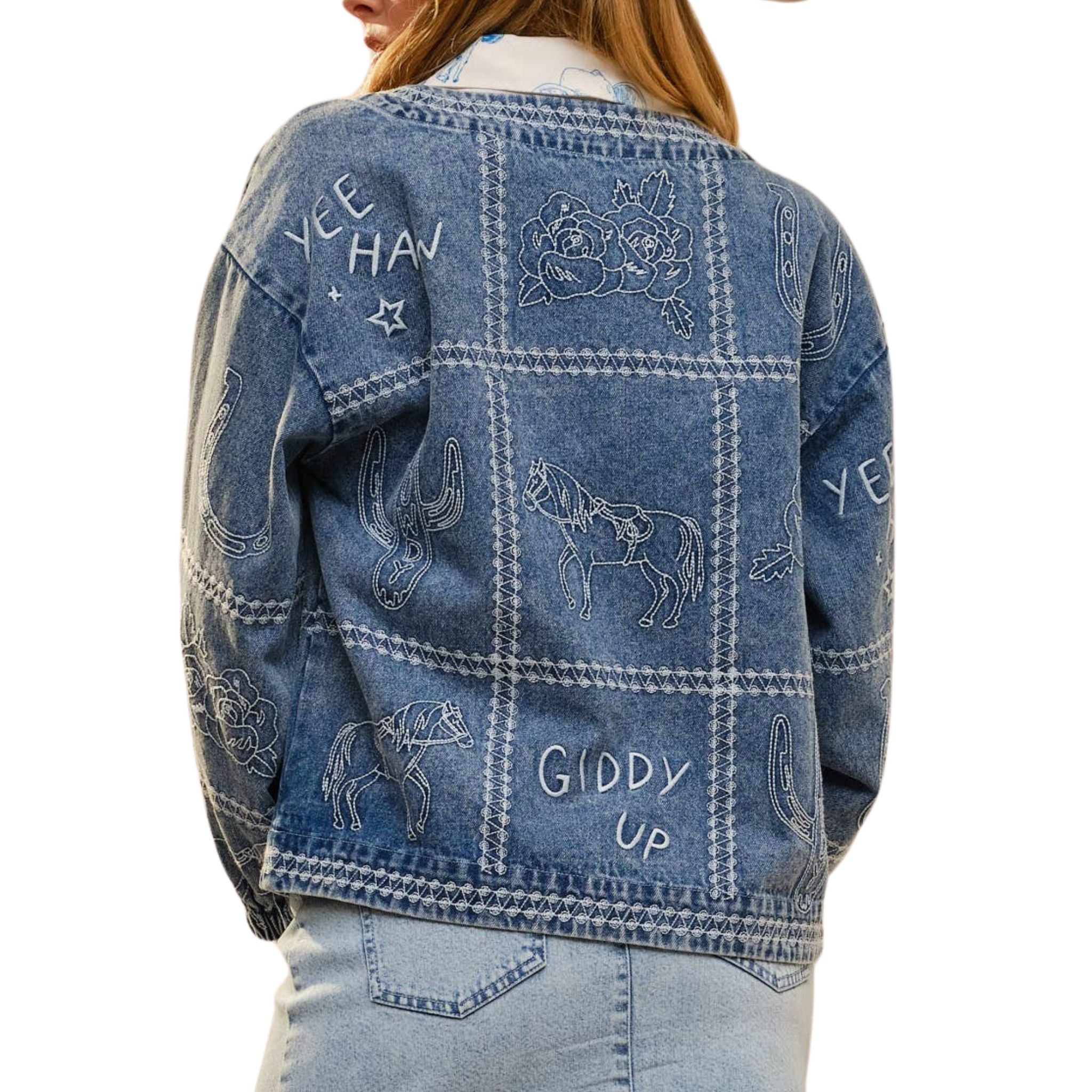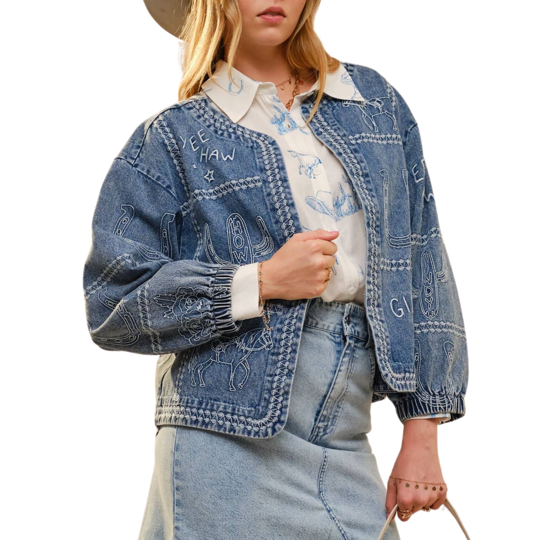 This denim jacket brings western charm with its all-over embroidered motifs—galloping horses, classic boots, and desert cacti—creating a storytelling piece perfect for rodeo season or everyday wear. The relaxed silhouette pairs a rounded neckline with voluminous puff sleeves and fitted elastic cuffs, balancing comfort with distinctive style. A versatile layer that celebrates the spirit of the American West.