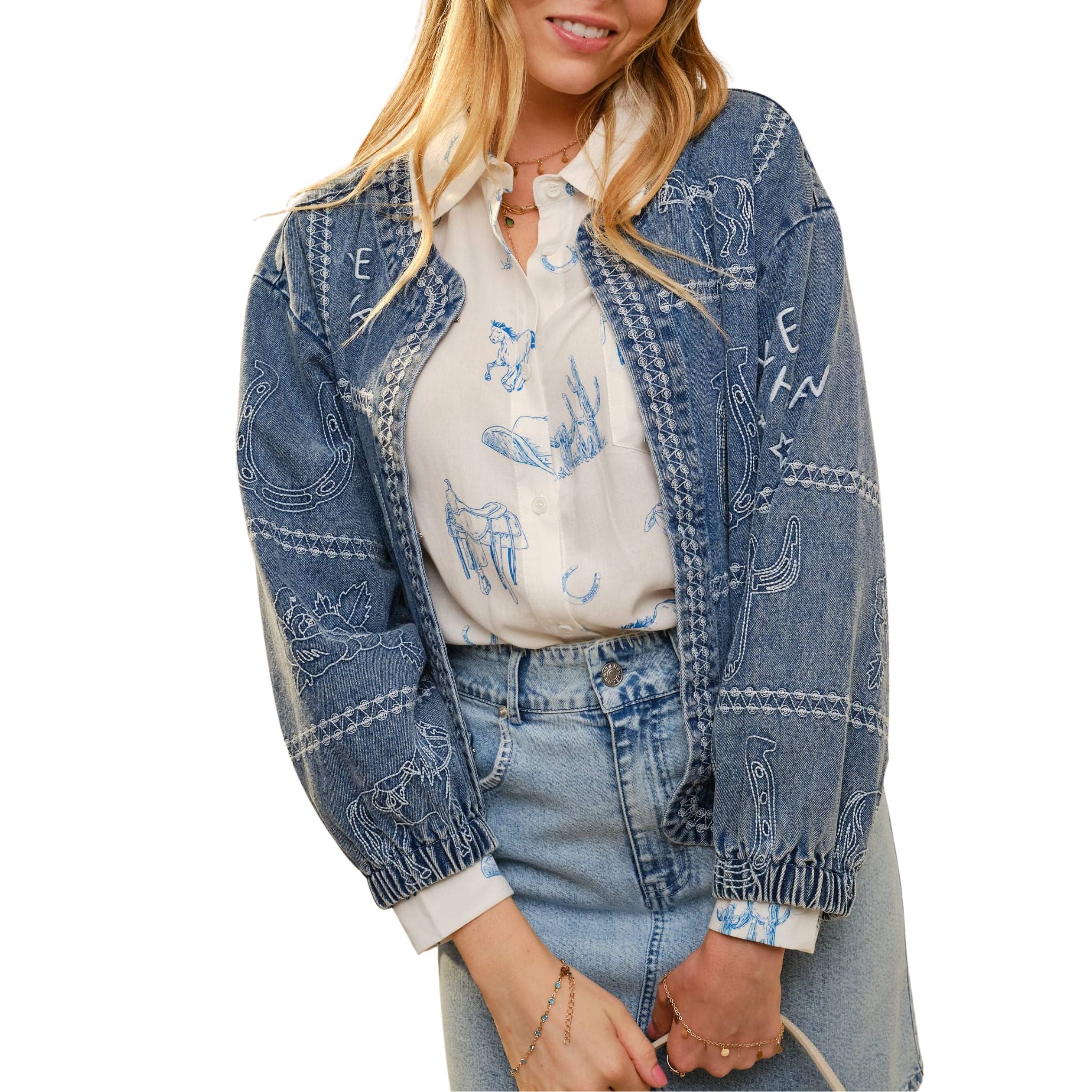 Western Embroidery Puff Sleeve Denim Jacket