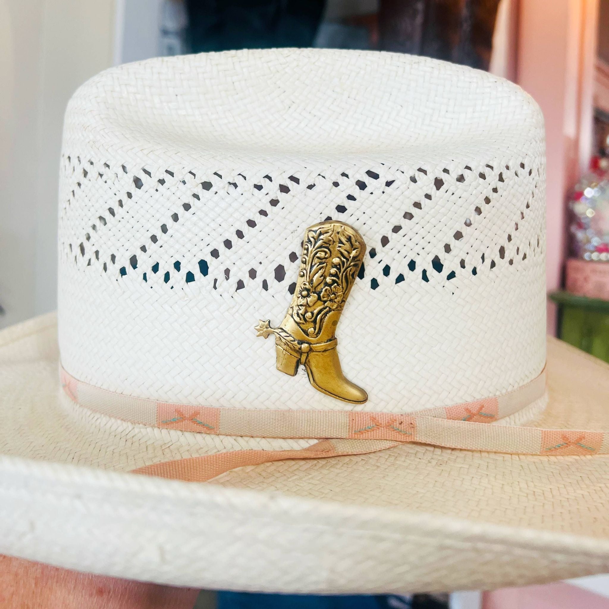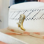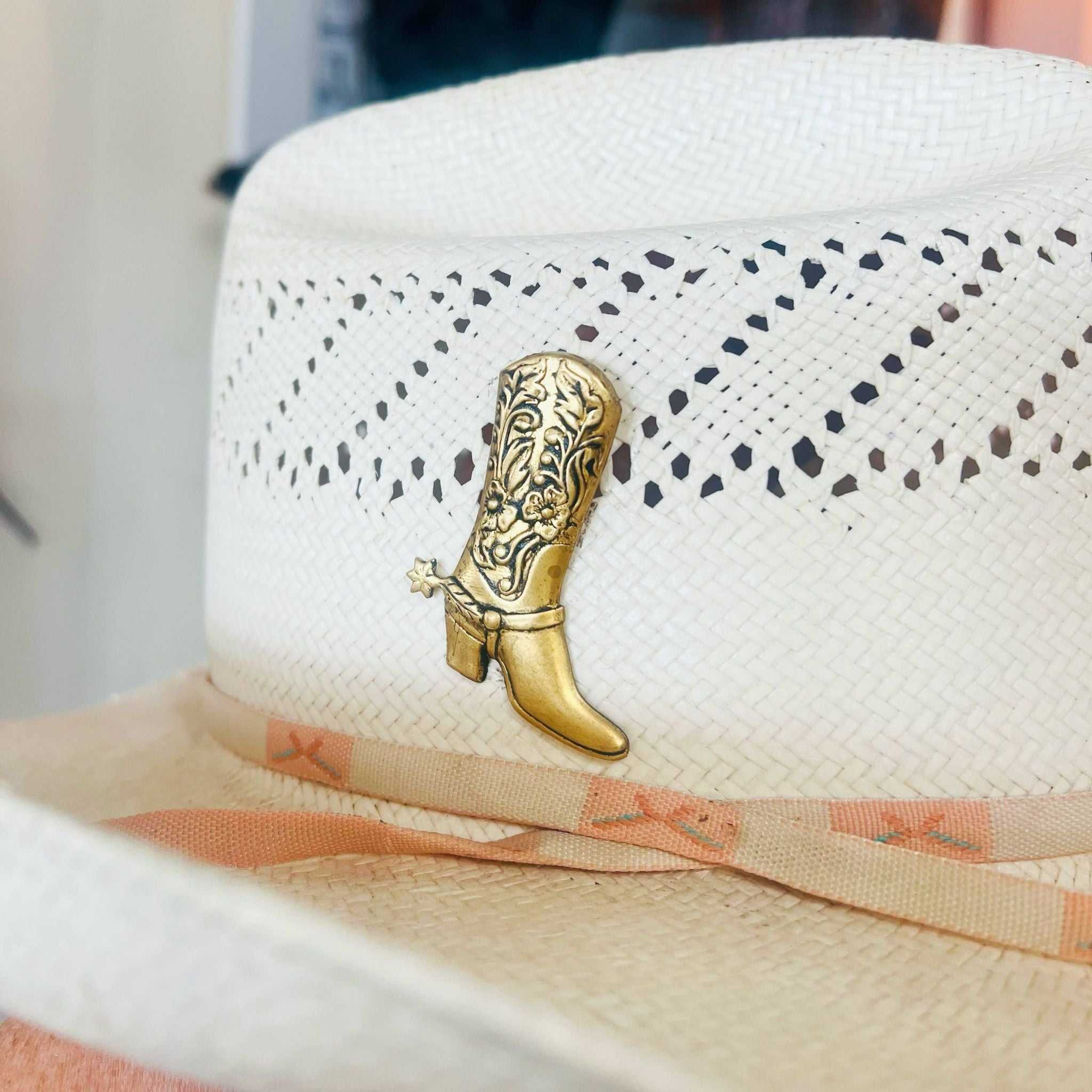 Western Aged Brass Cowboy Boot Hat Pin brings authentic character to your hat collection. Each piece undergoes a chemical patina process and dark wax seal, creating a unique aged finish that develops naturally over time. The pin-back design lets you rotate it across your favorite hats, building a personalized collection. No two pins are identical—every one carries its own weathered charm.