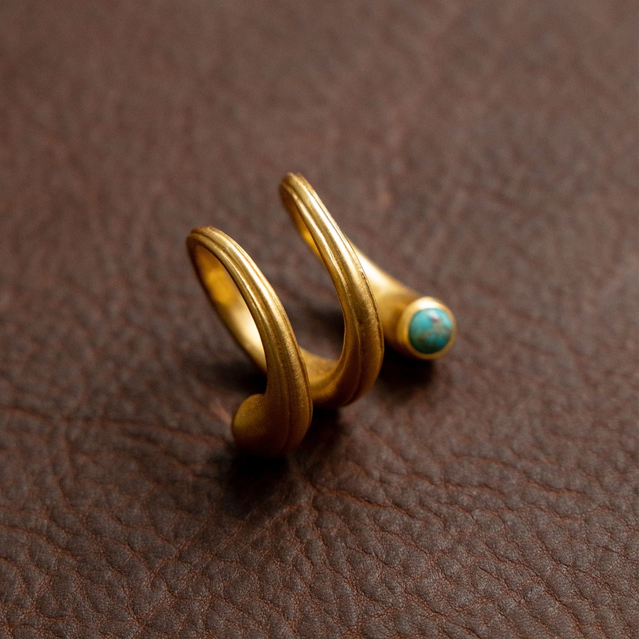 Inspired by winding desert streams and the quiet pull of movement, the Turquoise Whirlpool Ring is a sculptural statement with effortless western charm. Crafted in warm gold, this open spiral ring features two parallel embossed lines that flow continuously around the band, creating depth and texture from every angle. A round turquoise stone accents each open end, adding a vibrant pop of color that feels both grounding and eye-catching.