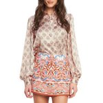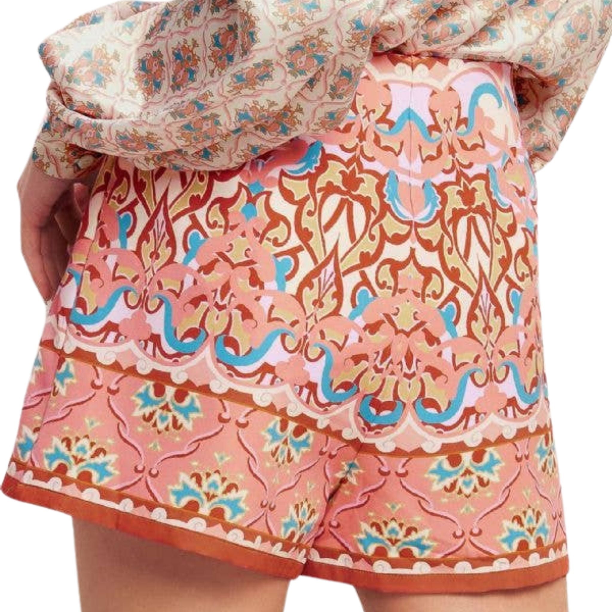 Bold and beautifully detailed, the Sunset Mosaic Mini Skort features a striking medallion-inspired print in warm pink, rust, and soft blue tones. Designed with the look of a skirt and the comfort of built-in shorts, it offers a flattering high-rise fit with easy wearability. Perfect for styling with blouses or fitted tops, this skort delivers statement style with everyday ease.