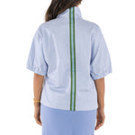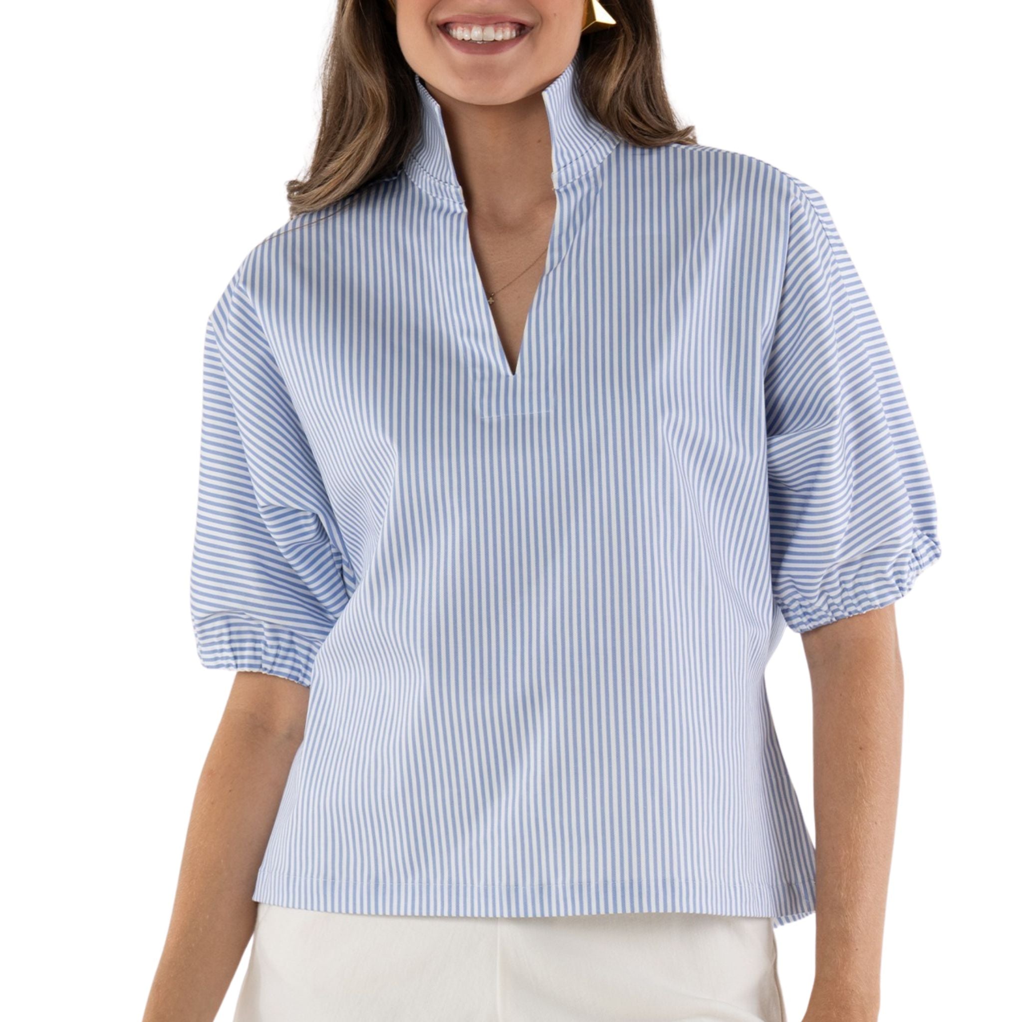 Effortlessly chic and timeless, this light blue striped top is a fresh take on a classic silhouette. Designed with a split neckline and subtle puff sleeves, it combines sophistication with everyday ease. The crisp cotton-blend fabric offers breathability and structure, making it perfect for warm days or layering under blazers. Pair it with white shorts or tailored pants for a polished yet relaxed look that transitions seamlessly from casual brunches to weekday errands.