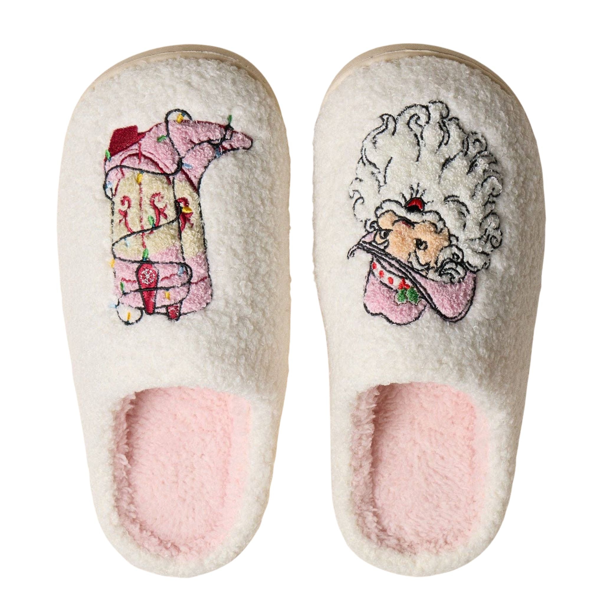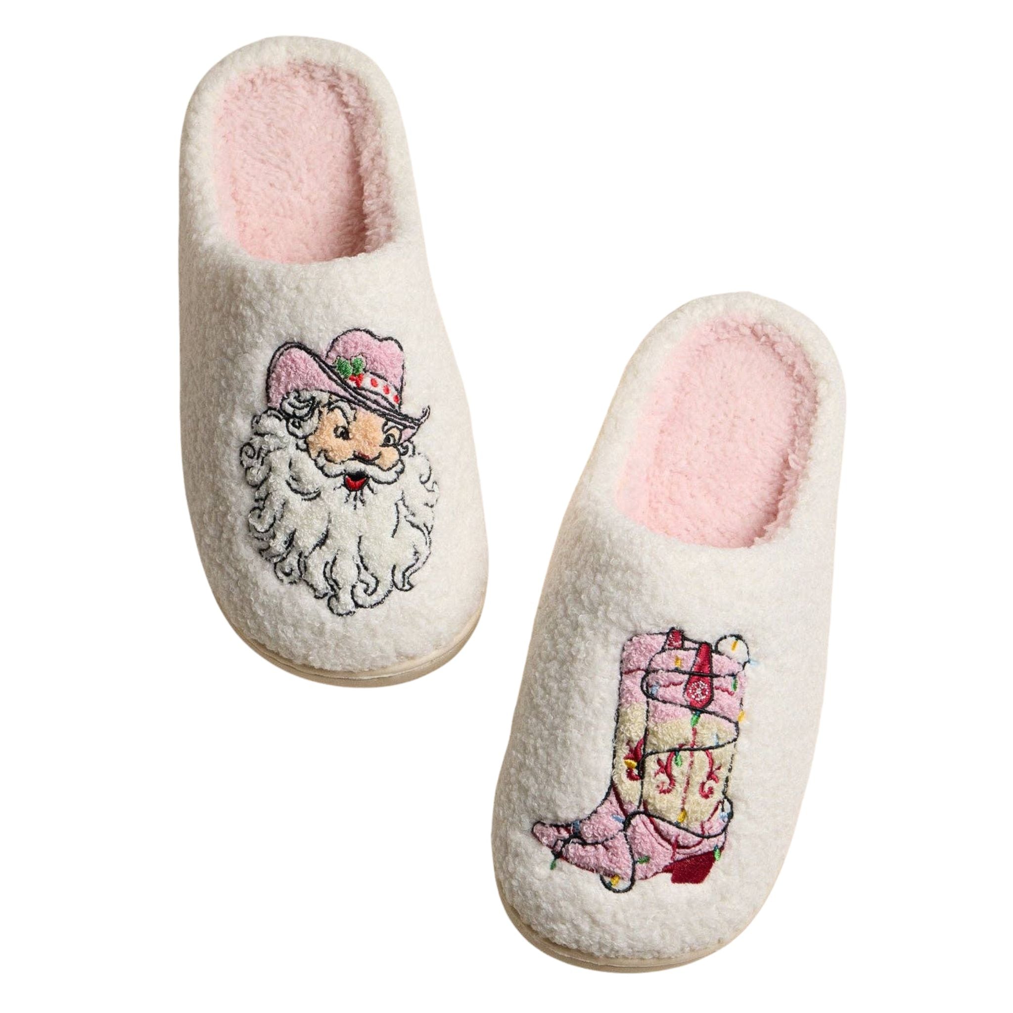 Get into the holiday spirit with these fuzzy slippers featuring playful Western-themed embroidery. One slipper showcases a jolly cowboy Santa in a pink hat, while the other displays a festive pink cowboy boot wrapped in holiday lights. Made with ultra-soft polyester fleece and a cozy pink lining, these slip-ons are finished with a durable non-slip sole—perfect for gifting or relaxing in festive comfort.