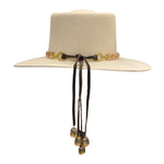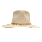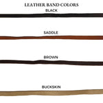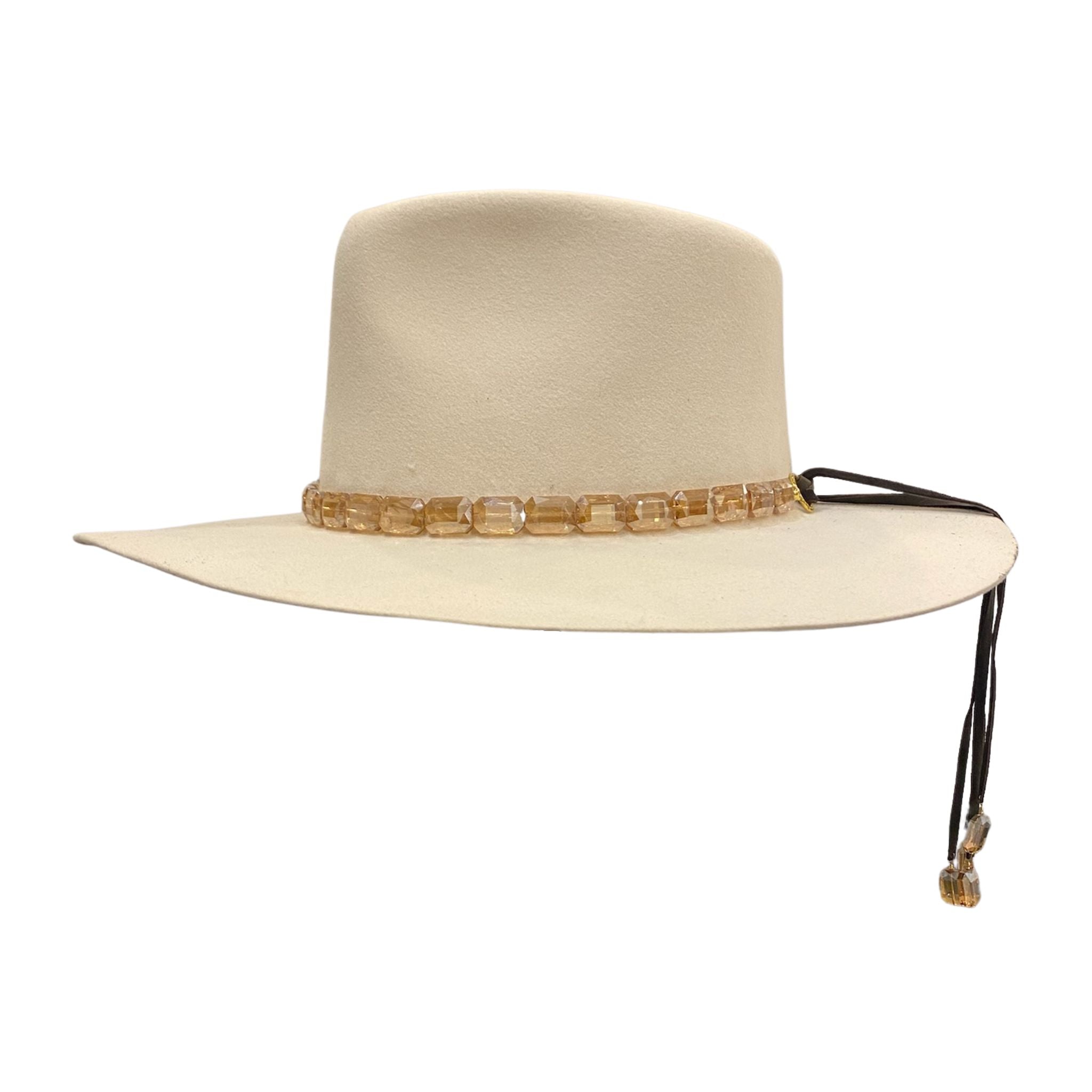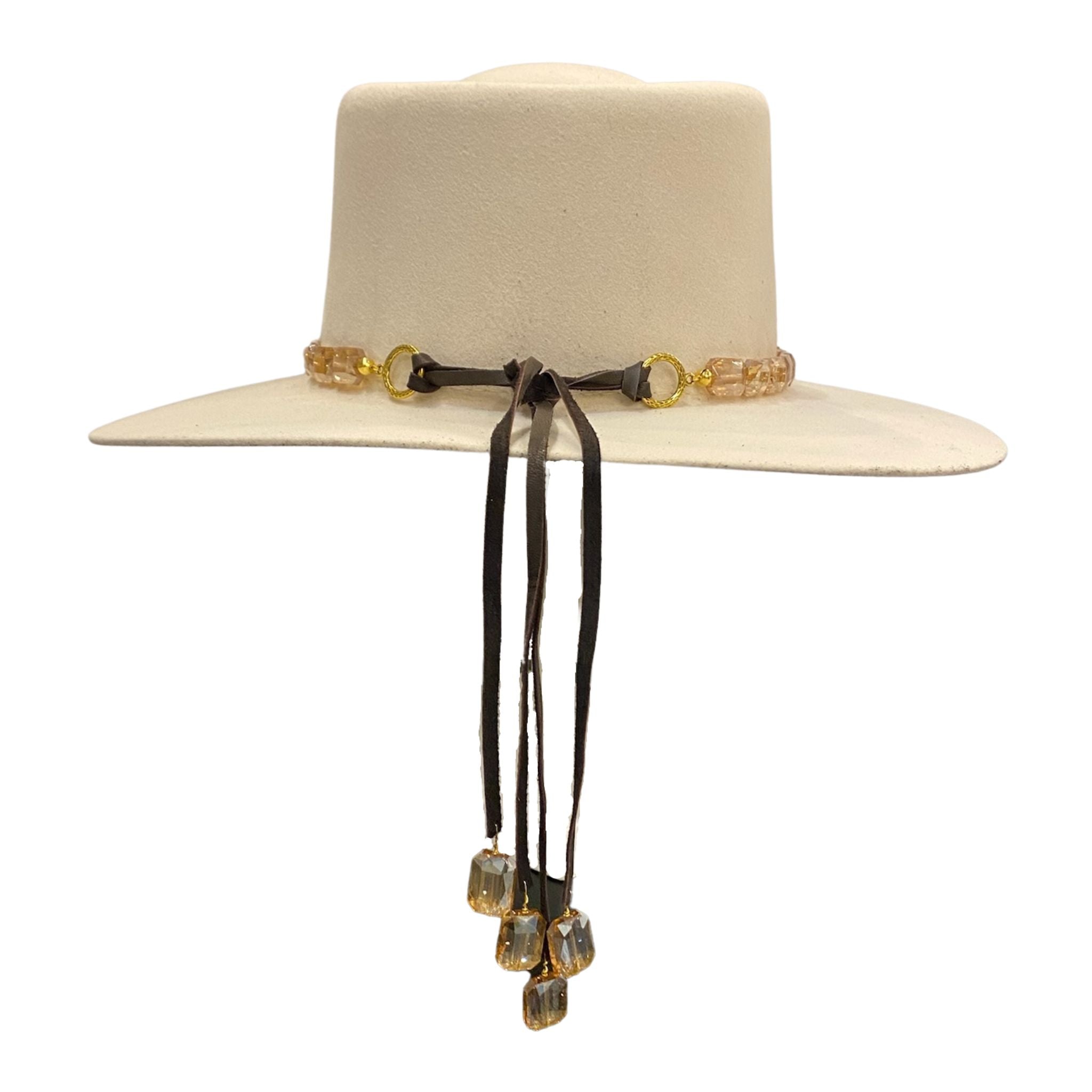 Personalize your favorite hats with our hand-crafted faceted champagne hat band. This hat band features sparkling faceted champagne beads that adorn the center of the leather band. Crafted from the finest North American deer hides, this hat band is soft, strong, and supple. Due to the self-tie nature of this hat band, it can be adjusted to best fit every cowboy hat in your collection. You can customize this hat band further to your preference by selecting your favorite color of leather band from those offered. This champagne hat band can also be repurposed and worn as a necklace!