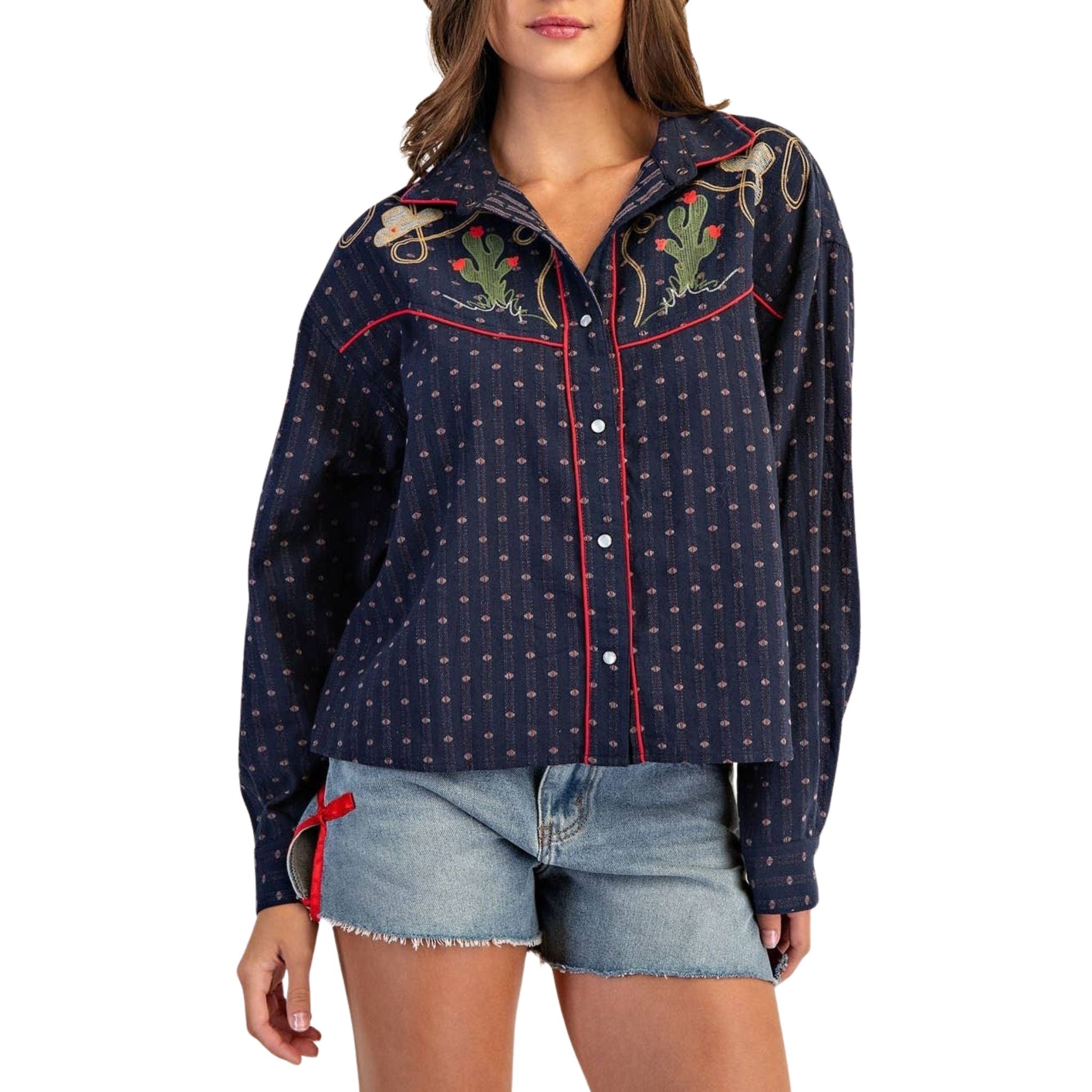 Bold and western-inspired, this navy button-down top features playful embroidered cactus and rope motifs across the yoke, accented with contrast piping for a standout finish. Designed with a relaxed fit, classic collar, and snap-button front, it brings character and charm to everyday denim looks with a fun, statement-making edge.