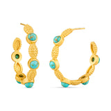 4Beloved hoops go to new heights in the Flights of Fancy Hoop Earrings. Round turquoise stones anchor textured 18K gold-plated brass in this charming hoops. These gold hoop earrings feature a post back and are hypoallergenic for comfortable all-day wear.  From everyday outfits to formal attire, the Flights of Fancy Hoop Earrings pairs well with everything you have planned. For a night out, team these turquoise hoop earrings with our Birds of a Feather Layered Necklace. For a laid-back look, style these hoops with our Birds of a Feather Ring Set or create an arm party with the Noble Bangle and Float On Bangle.