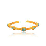 Infuse a little Grecian style into your look with the Island Hopping Cuff. Inspired by the beauty of the Greek isles, this simple bracelet features a turquoise center stone set into hammered 18K gold-plated brass. Flanked by smaller stones, this turquoise bracelet has an open back and is adjustable for your own best-fit. Studded details flank the smaller stones on this gold bangle.