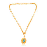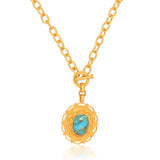 Embrace wanderlust when you add the Meet Me in Mykonos Toggle Necklace. This pendant necklace features a cable chain crafted from 18K gold-plated, nickle-free hypoallergenic brass. The pendant boasts an oval turquoise stone set into textured gold with a scalloped detailing around the edges. A toggle closure completes this simple yet statement-making turquoise necklace.