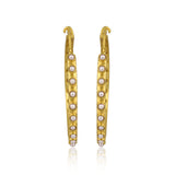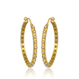 Bold gold and pearl details make the Pearl Hoop Earring a statement piece in your jewelry collection. These hoop earrings feature a clasp closure and are crafted from brass and are plated in 18K gold that has a textured design. Round pearl stones are inlaid in bezel settings throughout the hoop earrings. These gold hoop earrings will add a shine to any outfit. Pair these statement-making pearl hoops with our Pearl Circle Pendant Necklace to complete the look. This hoop earring will become your everyday accessories.