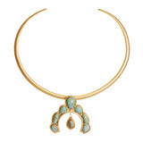 Our Squash Blossom Pendant is a serious must have statement necklace piece. This gorgeous pendant has a truly unique design featuring 7 small turquoise stones along the shape and a hanging stone in the middle. You can put this pendant on your favorite gold chain, or pair it with our gold collar necklace for a choker style necklace.