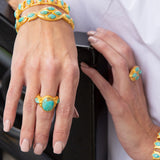 Instantly elevate your look when you add the Iris Ring in turquoise to your jewelry box. This bold cocktail ring features a large, oval center turquoise stone and two petal-shaped stones flanking each side. Regal and eye-catching, this ring is crafted from 18K gold-plated brass and has an open back to adjust the fit to your preferred finger. Pair this turquoise statement ring with the Water Lily Cuff and Water Lily Drop Earrings for a polished look. Also available in green strawberry quartz.