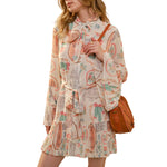 Step into Western charm with this mini dress, where vintage desert motifs meet playful feminine details. The cactus and floral print captures classic Southwestern style, while the tie neckline adds an adjustable, flattering touch. Tiered pleating at the hem creates movement and dimension, and bell sleeves complete the romantic, retro-inspired look. Perfect for rodeo season, festivals, or anyone drawn to bold, nostalgic prints.