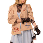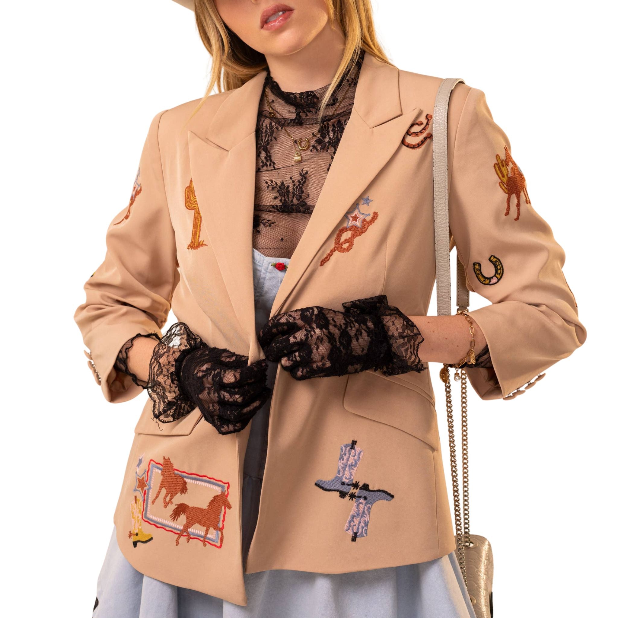 Crafted with Western flair, this tailored blazer showcases intricate embroidery depicting horses, cacti, and classic cowboy imagery across the fabric. Ruched sleeves add movement and dimension, while functional front flap pockets and a single-button closure deliver both style and practicality. The structured silhouette balances polish with an effortlessly relaxed aesthetic, making it a versatile layer for any occasion.