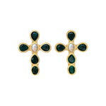 Add a touch of festive elegance with the Eternal Grace Cross Stud Earrings in Emerald, a limited-edition design perfect for the season. Crafted in 22K gold-plated brass, these earrings feature five faceted pear-shaped dyed emerald agate stones accented with a faceted oval moonstone, creating a luminous, sparkling cross design that catches the light from every angle.