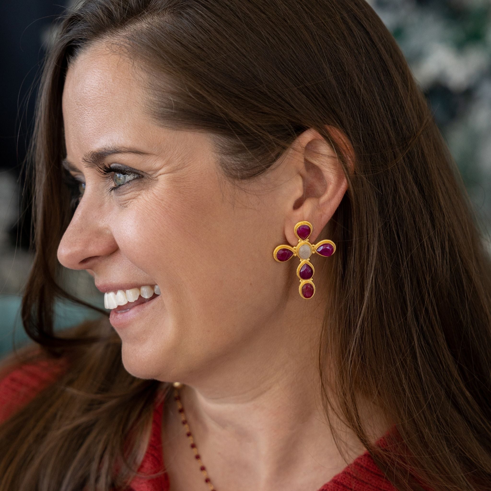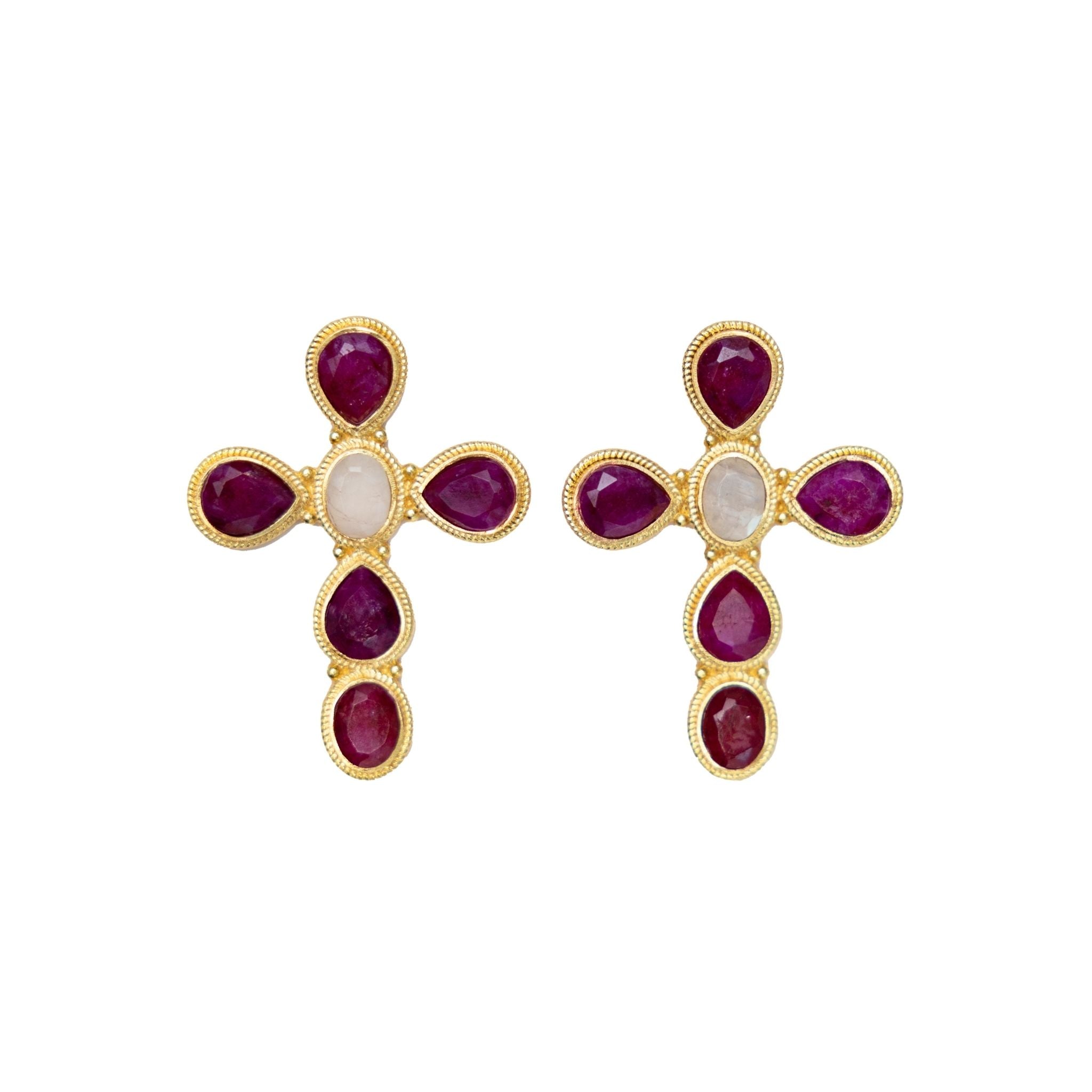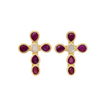 Celebrate the season with the Eternal Grace Cross Stud Earrings in Ruby, a limited-edition design that brings festive sparkle to your jewelry collection. Crafted in 22K gold-plated brass, these earrings feature five faceted pear-shaped dyed ruby agate stones and a faceted oval moonstone, perfectly balancing rich holiday tones with luminous shimmer.