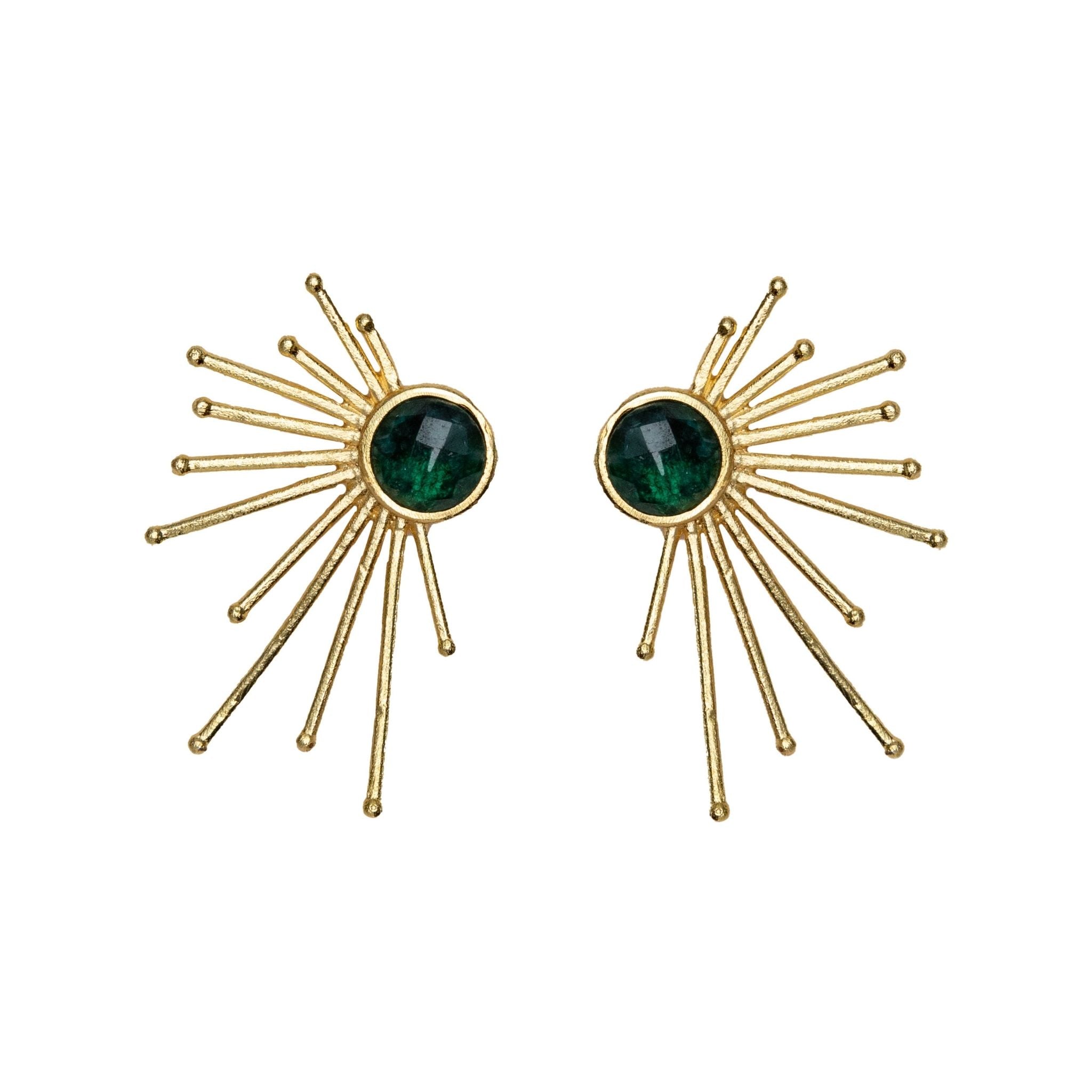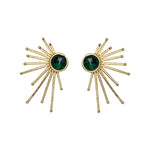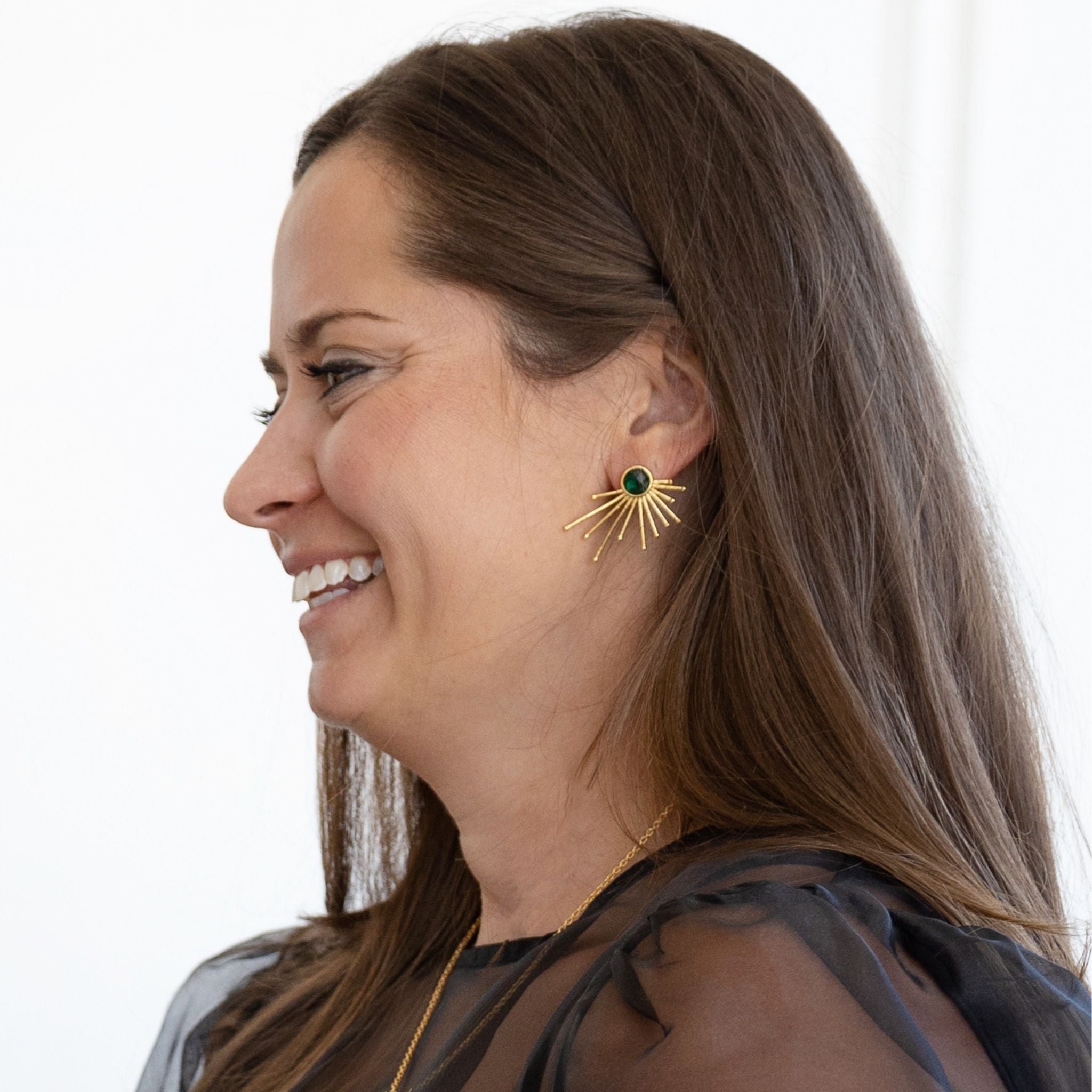Shine bright with a hint of holiday magic. The Gilded Evergreen Stud Earrings in Emerald feature a vibrant emerald agate stone with textured rays radiating from one side of the stud, catching light in a beautiful and unique way. Crafted in 22K gold-plated brass, these limited-edition stud earrings offer a subtle yet striking statement, perfect for holiday gifting, seasonal celebrations, or layering with other gold jewelry.