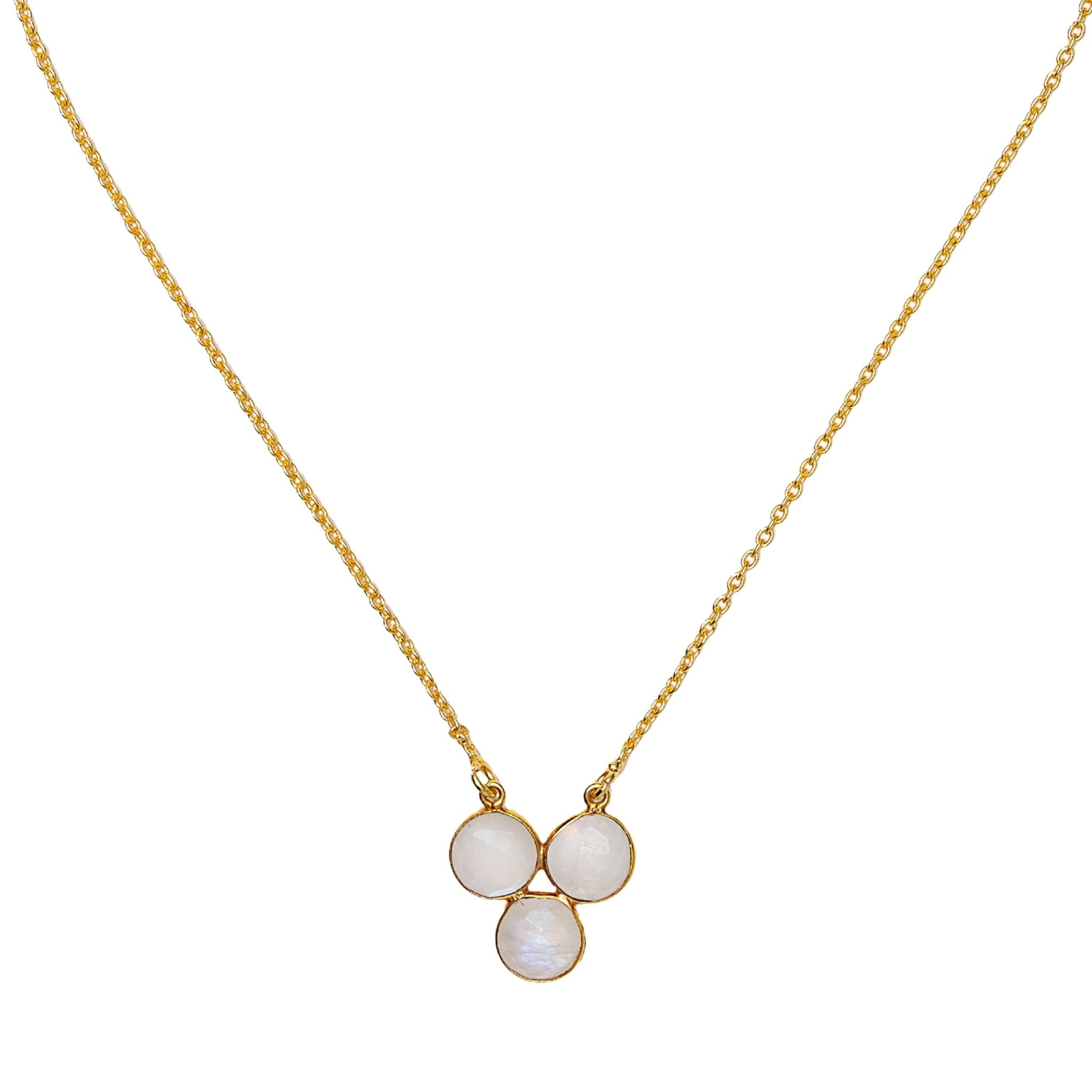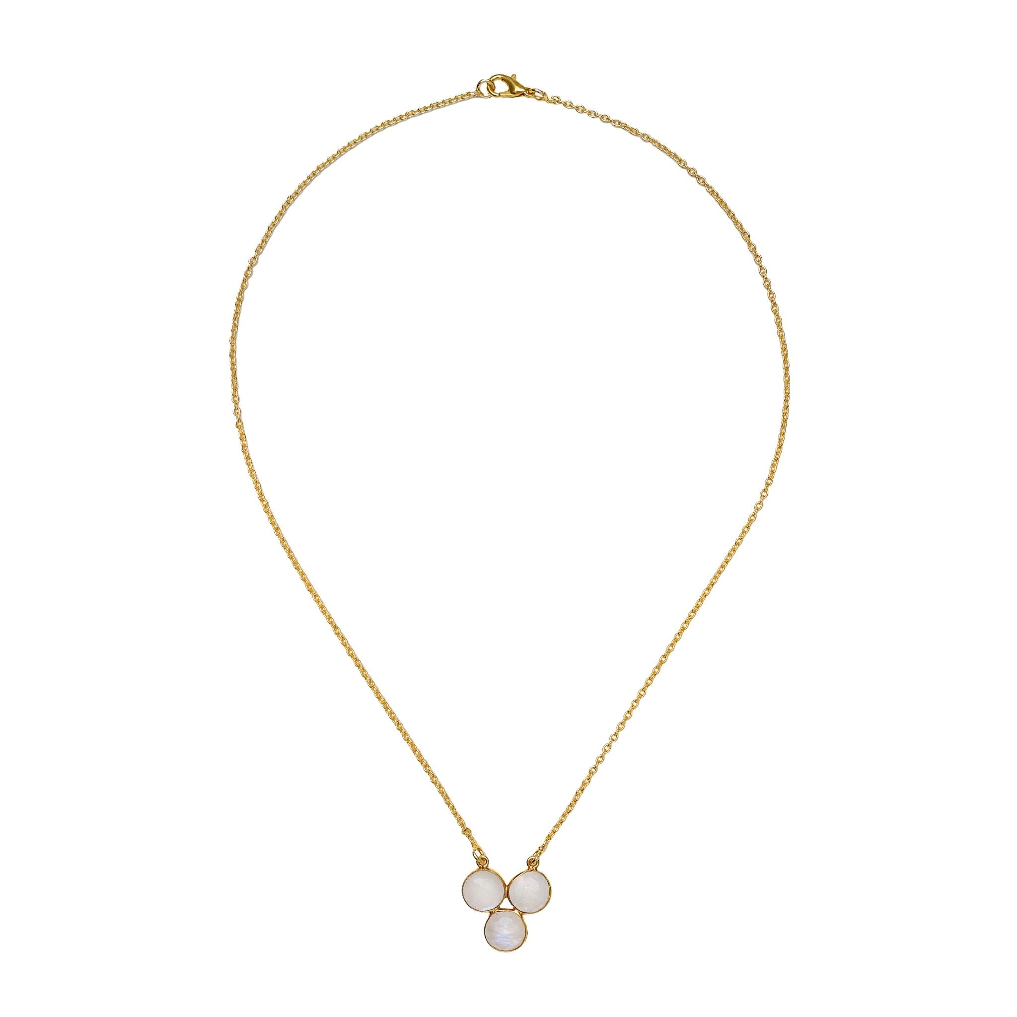 Subtle sparkle for the season and beyond. The Gilt and Frost Pendany Necklace features a delicate 22K gold-plated chain with a stationary pendant of three small circular moonstones set in gold, offering understated elegance with a touch of festive shimmer.