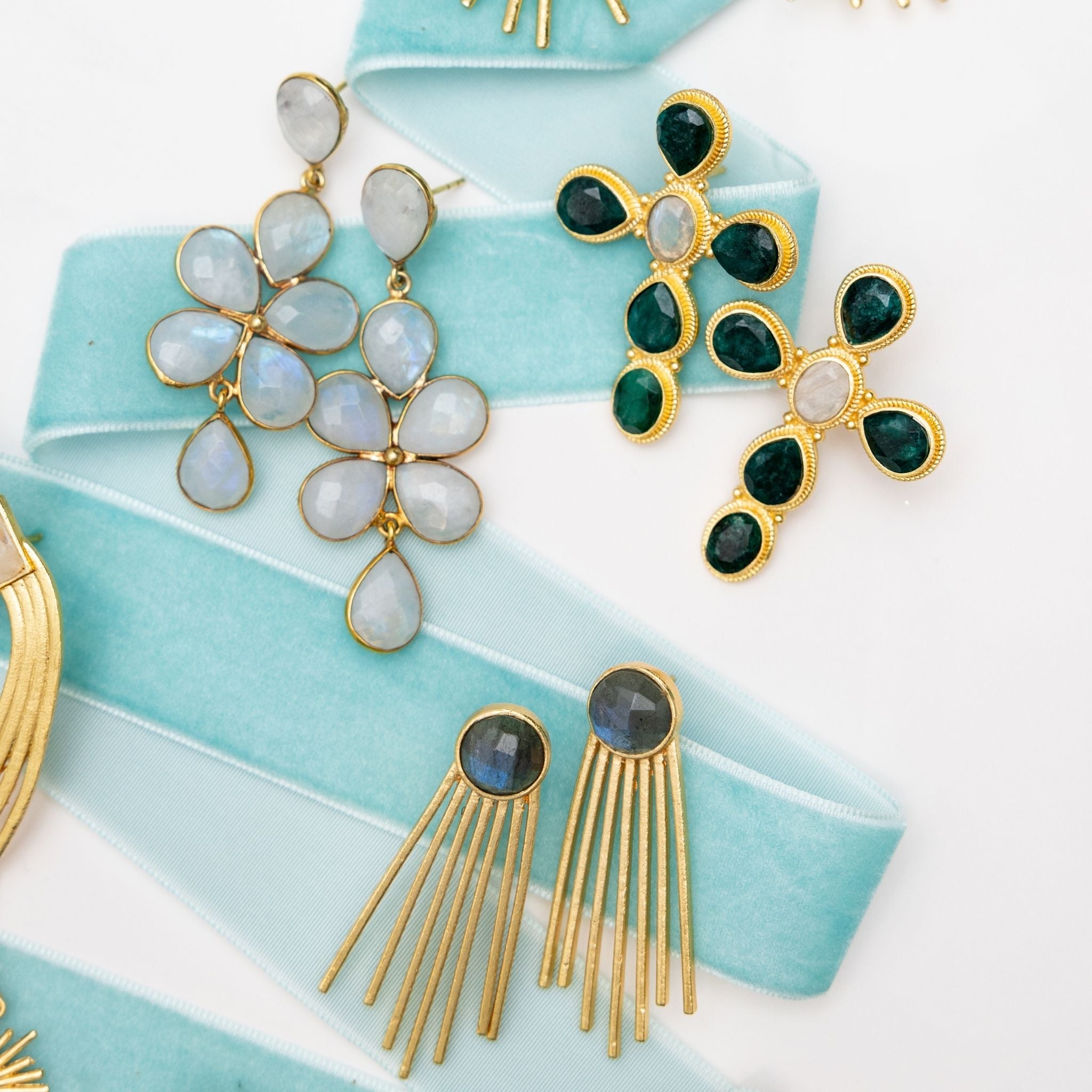 Catch the light with every turn. The Moonlit Fringe Earrings feature labradorite stones set into 22K gold-plated brass with elegant fringe detailing that sways beautifully with movement. The iridescent labradorite adds subtle flashes of color, evoking the magic of moonlight on a winter night.