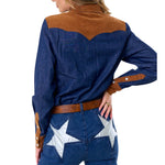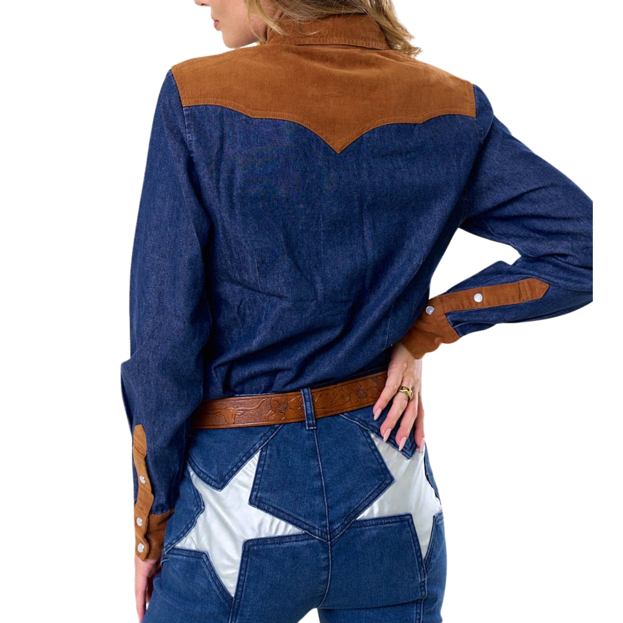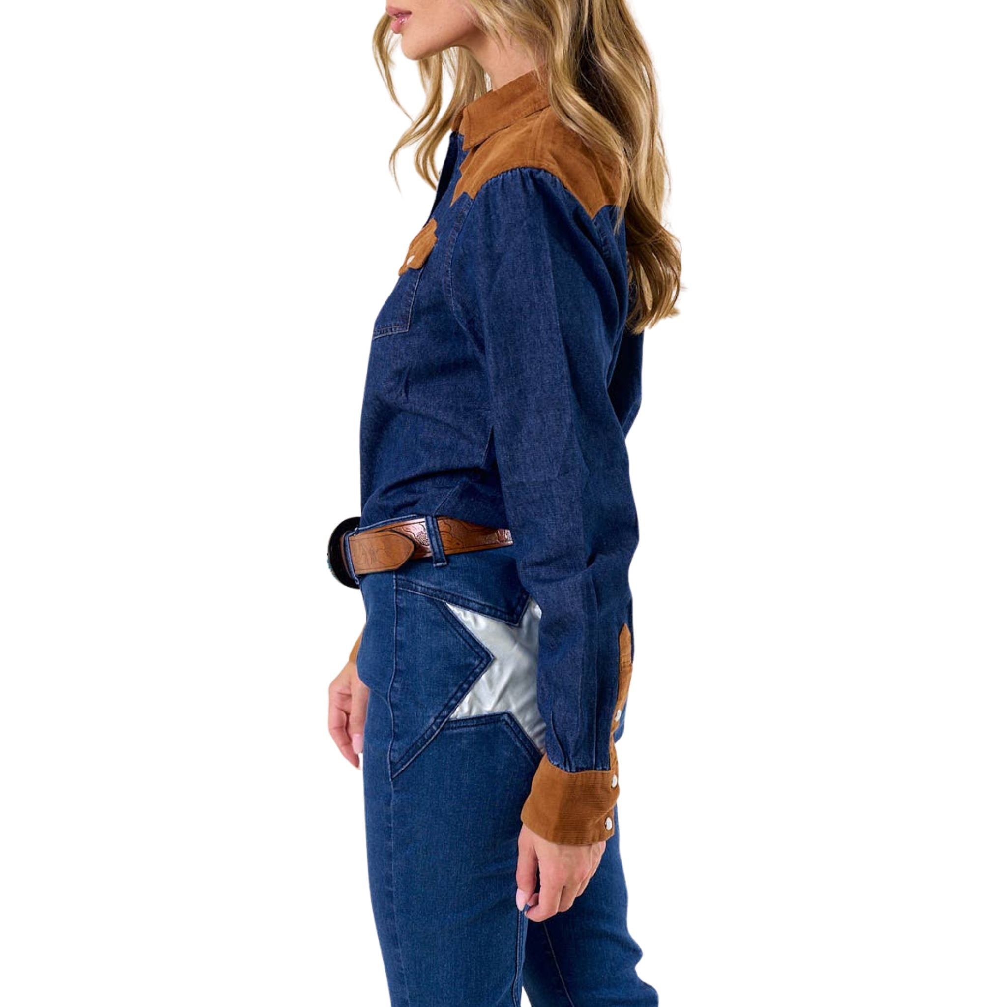 Western-inspired with a modern edge, this denim top features contrast suede-look detailing at the yoke, chest pockets, and cuffs. Designed with a classic snap-button front and a flattering, structured fit, it’s an easy statement piece that pairs perfectly with denim or tailored bottoms for an elevated casual look.