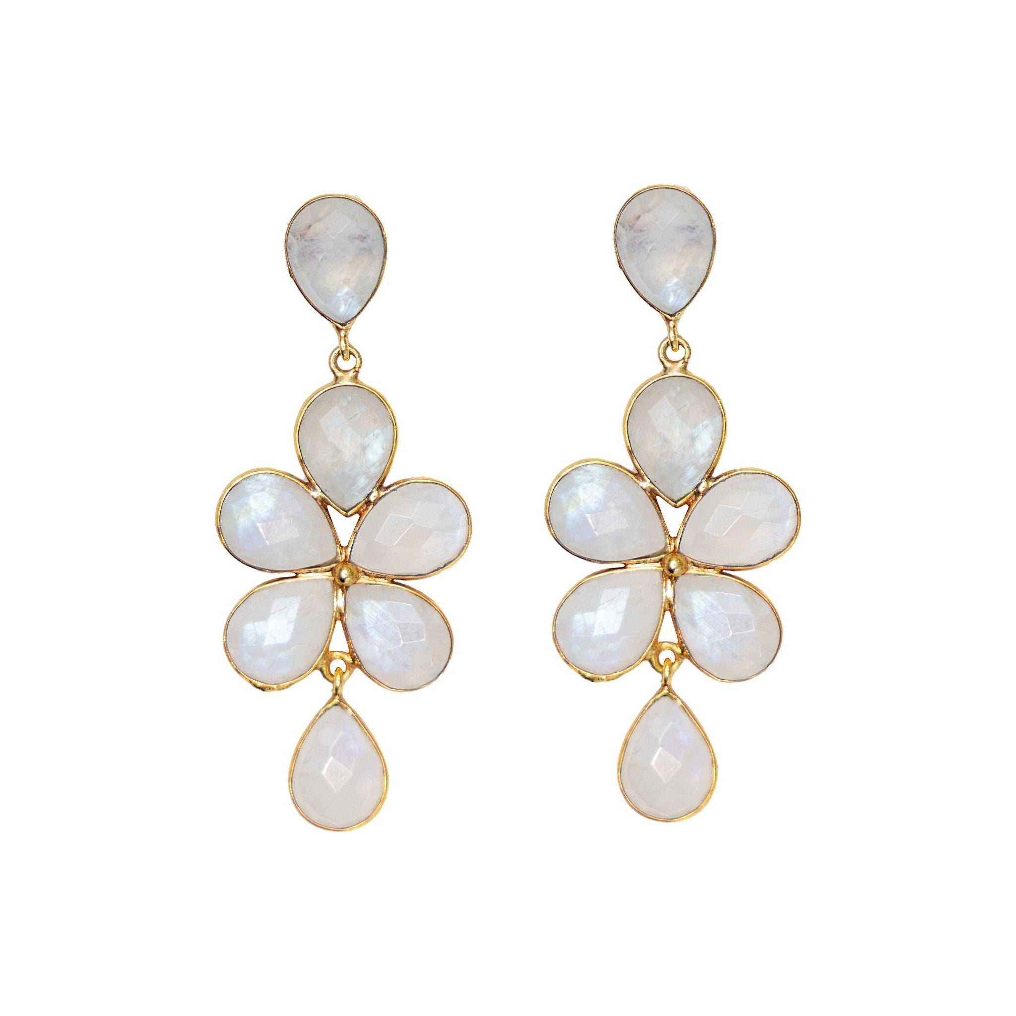Capture the glow of a beautiful winter night. The Snowlit Night Drop Earrings are a limited-edition statement piece from the Holiday Magic Collection, featuring hanging white translucent moonstones set into 22K gold-plated brass. Each faceted moonstone catches the light beautifully, creating a subtle shimmer reminiscent of snow sparkling under the moon.