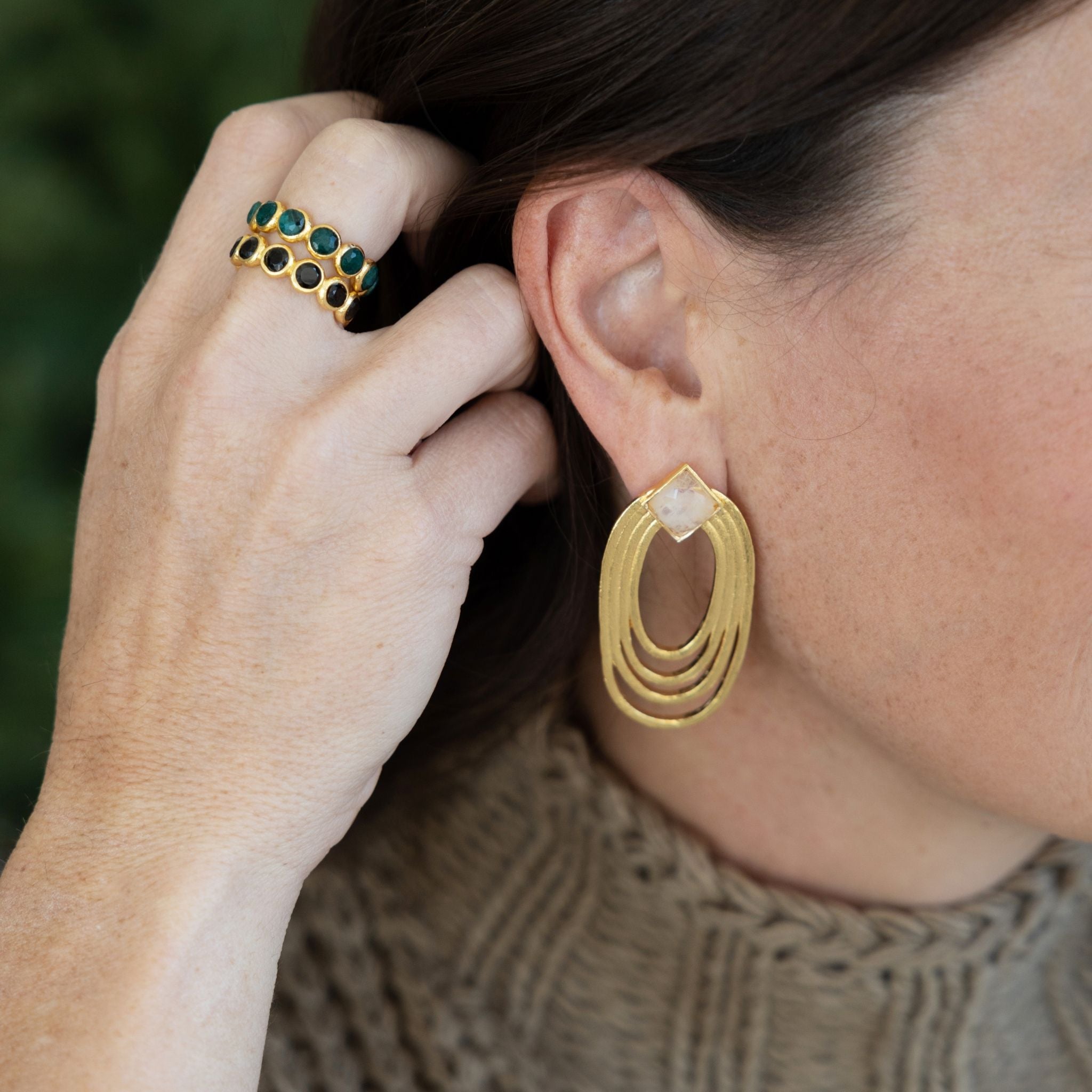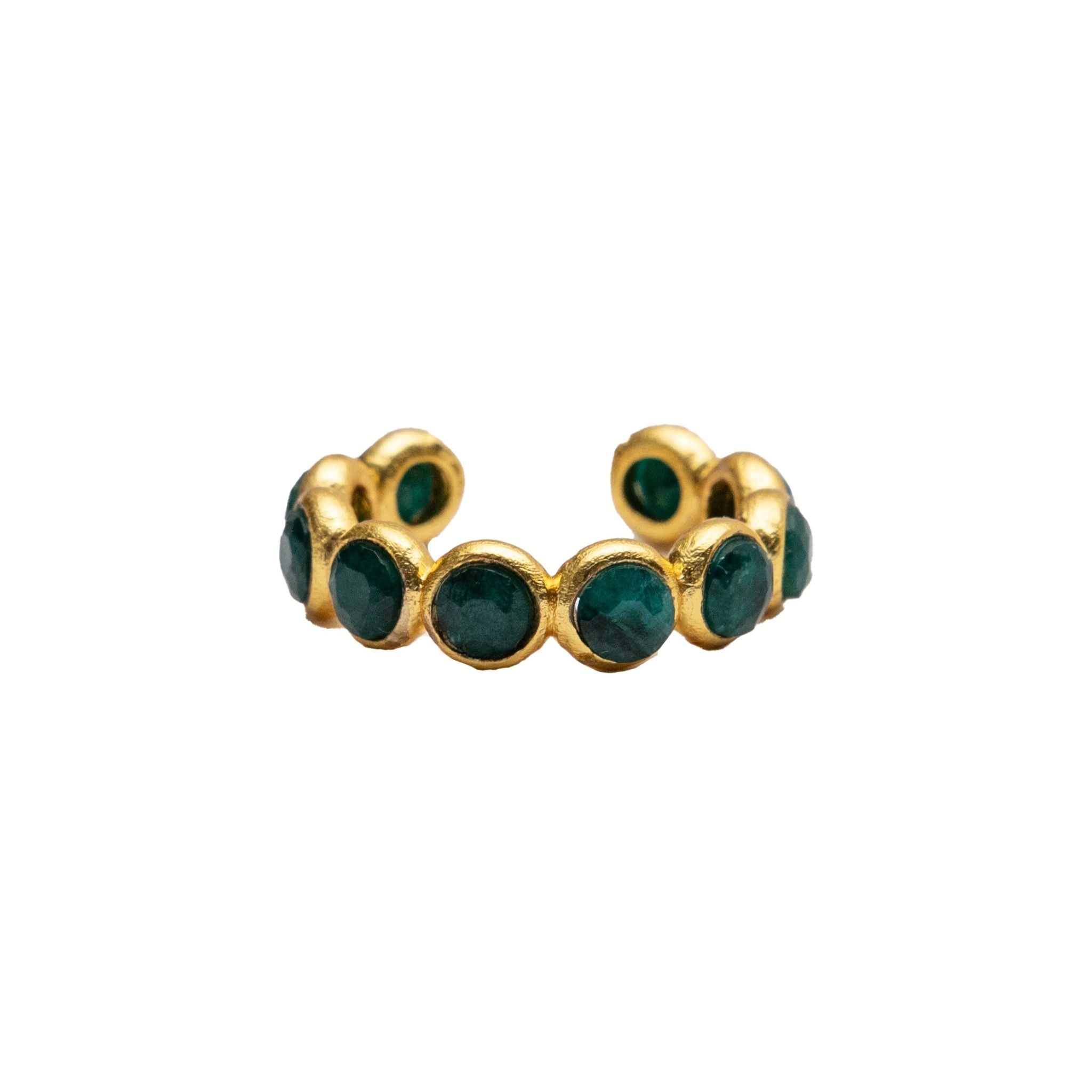 Trim the tree, and your hand, in style with the Winter Magic Ring in Emerald. This ring is a limited-edition statement piece from the Holiday Magic Collection, featuring faceted circular emerald agate stones set into matching 22K gold-plated circular settings. The adjustable open-back design makes it easy to wear and perfect for styling with other rings.